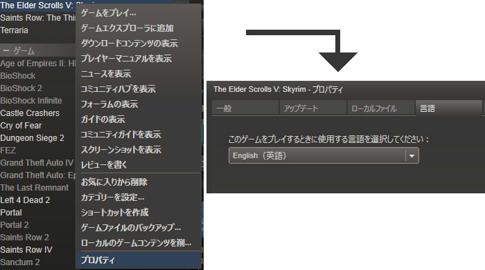 スチームメニューからライブラリのゲーム一覧にあるThe Elder Scrolls V:Skyrimを選択して右クリックからプロパティを開く。