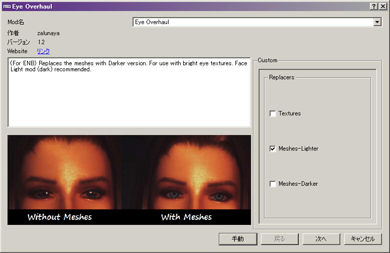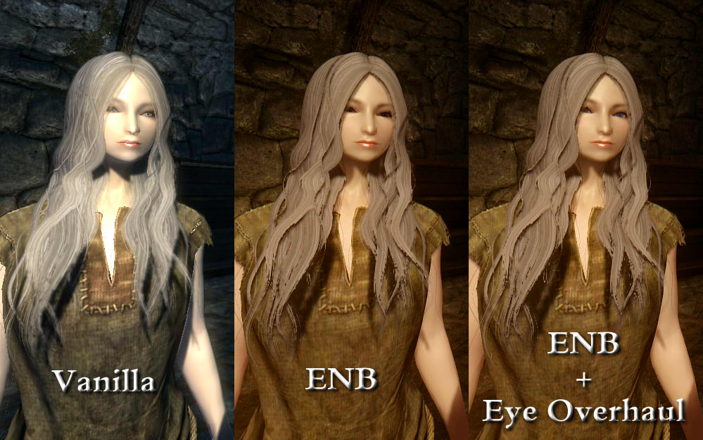 http://www.nexusmods.com/skyrim/mods/55435/こちらのメッシュはスクリーンショットの通り、一部の環境で発生する目が黒くなる(光が入らなくなる)症状を修正してくれます。